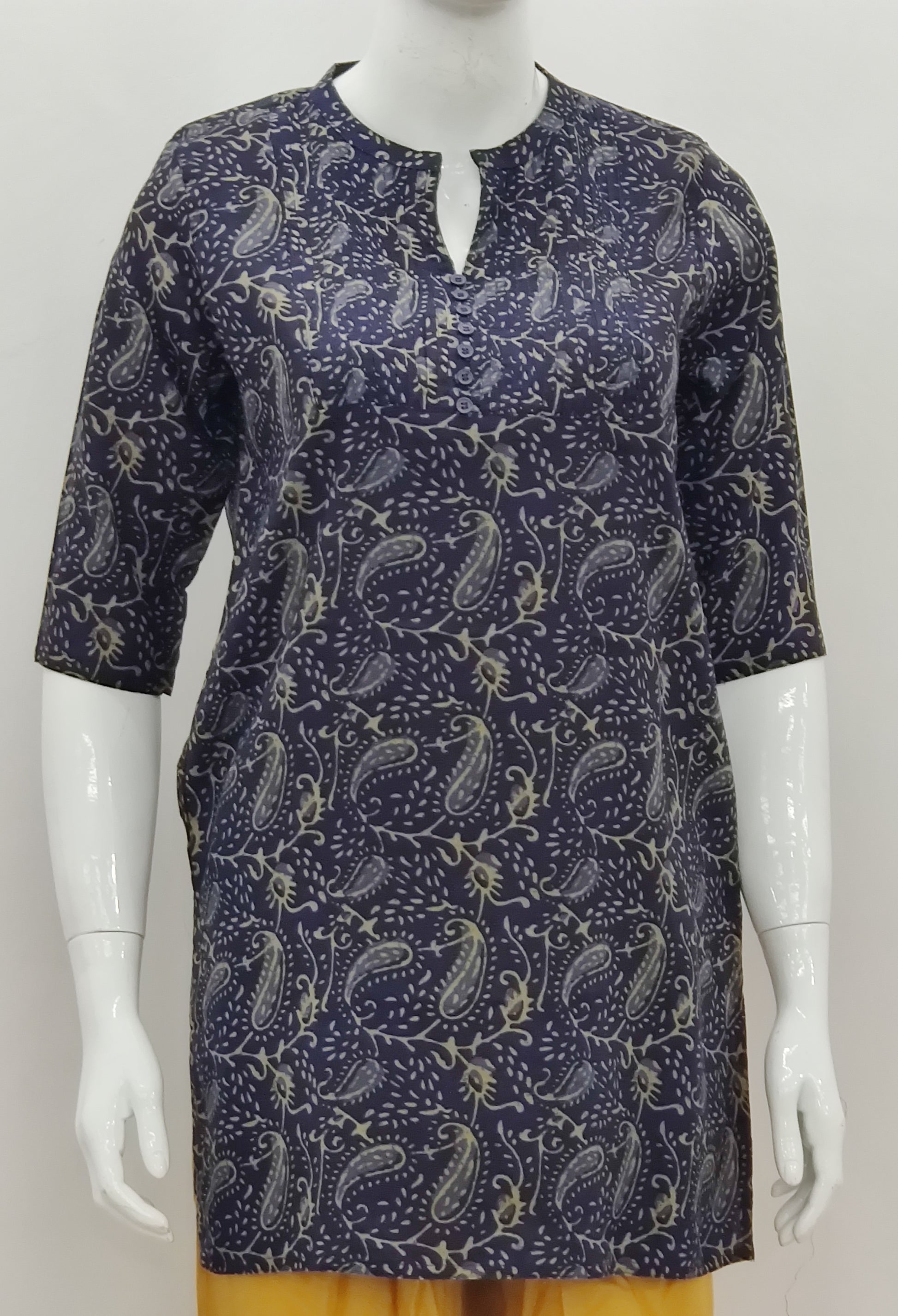 Discover the charm of this short kurti adorned with an eye-catching paisley pattern. The rich navy or black fabric serves as a backdrop for the elegant cream, grey, and olive green paisleys. The round neckline with a stylish V-cutout adds a unique touch. The three-quarter sleeves complete the look. This top is a wonderful choice for those who appreciate detailed prints and comfortable style.