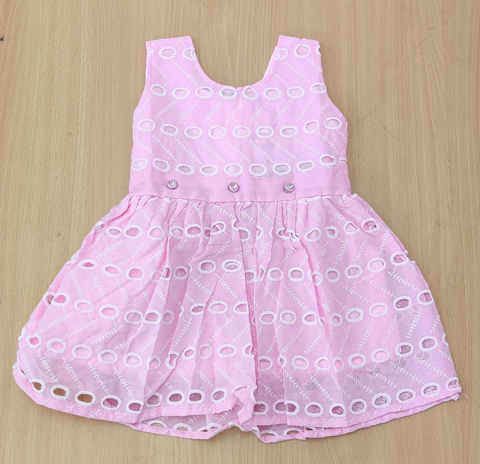 Sweet and summery sleeveless eyelet dress for girls. Features a lovely embroidered pattern and cute button details. Perfect for warm weather.